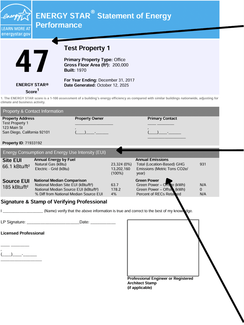 ENERGY STAR Score is a relative rating for a building’s efficiency on a scale of 1 to 100, with 50 representing the average EUI of the similar buildings, normalized for a variety of buildings’ varying business characteristics. Higher scores equate to higher performance, and buildings with a score of 75 or higher are eligible for ENERGY STAR Certification.
