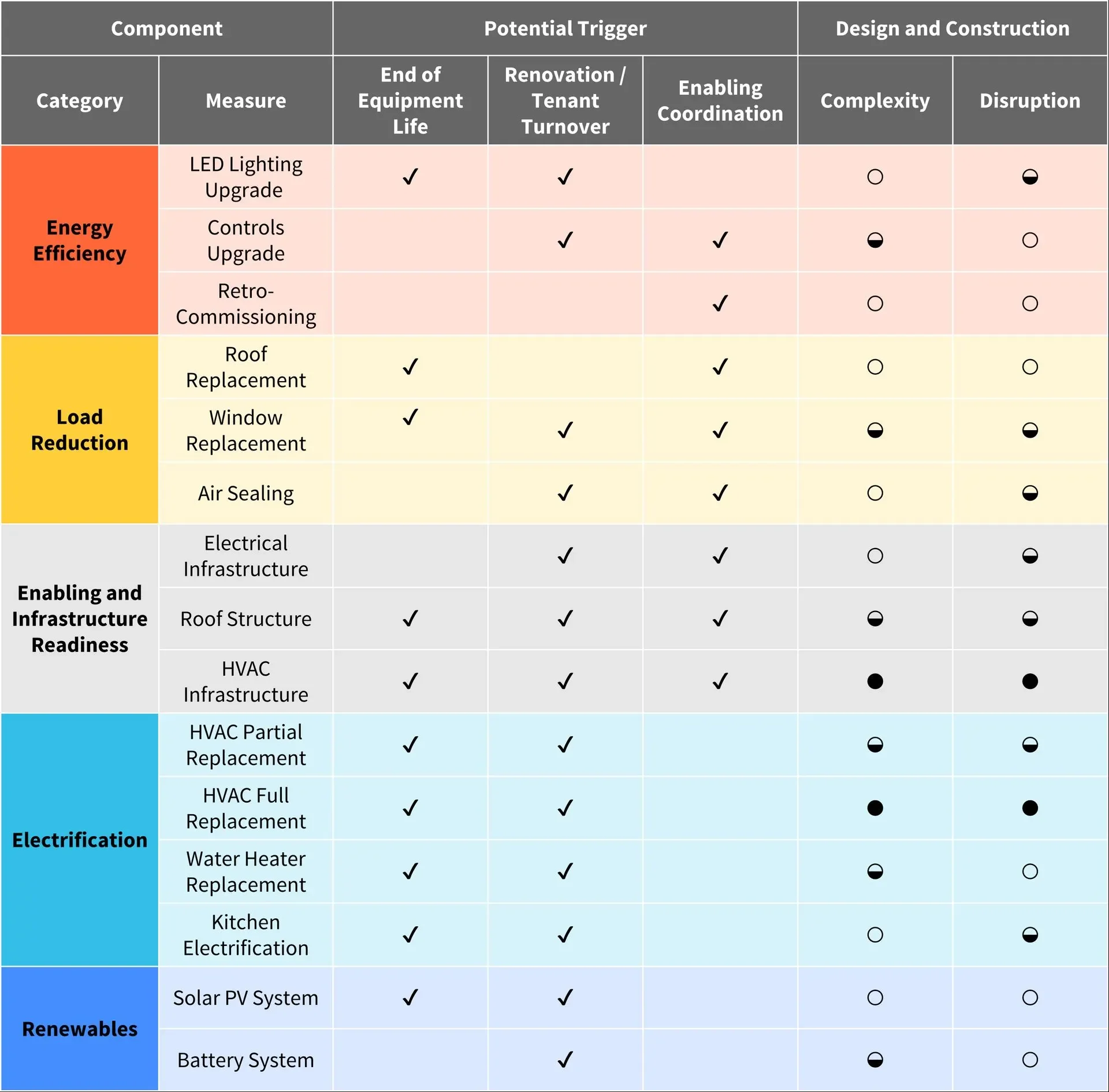 Identifying investment triggers for specific measures along with implementation considerations is important to establishing a realistic capital investment plan. Some measures may be able to be put in service at any point during the decarbonization plan’s timeline while the timing of others may be driven by a particular need or dependency. The level of complexity or extent of disruption will also differ across measures and steps within the plan. Some may be straightforward to implement, while others may require lengthy construction schedules and interrupt operations.