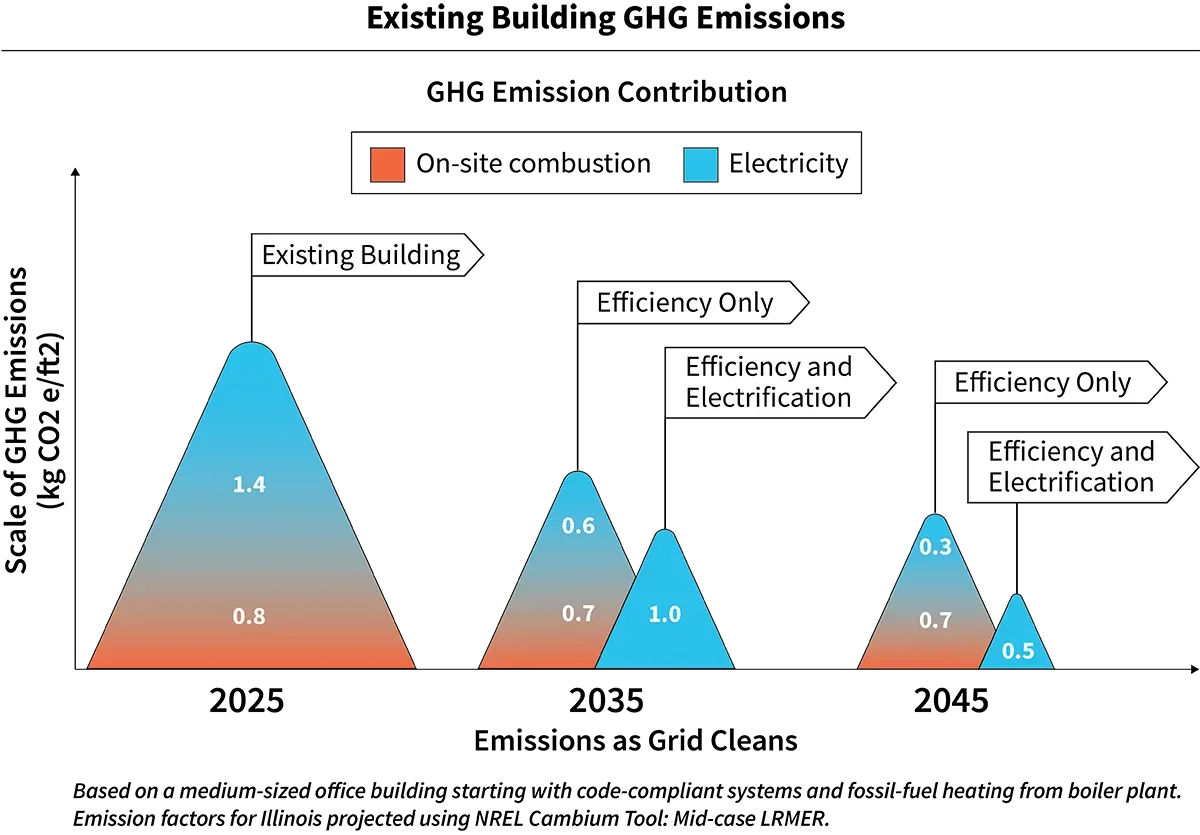 As we move forward in time, emissions from heating and other onsite combustion uses (such as cooking and domestic hot water) eventually reach a limit on how much they can reduce emissions—since, after all, they continue to burn fossil fuels. However, electrifying heating helps the building reduce its emissions much more dramatically, since the building will get more and more energy from renewables on the grid and has less onsite combustion.