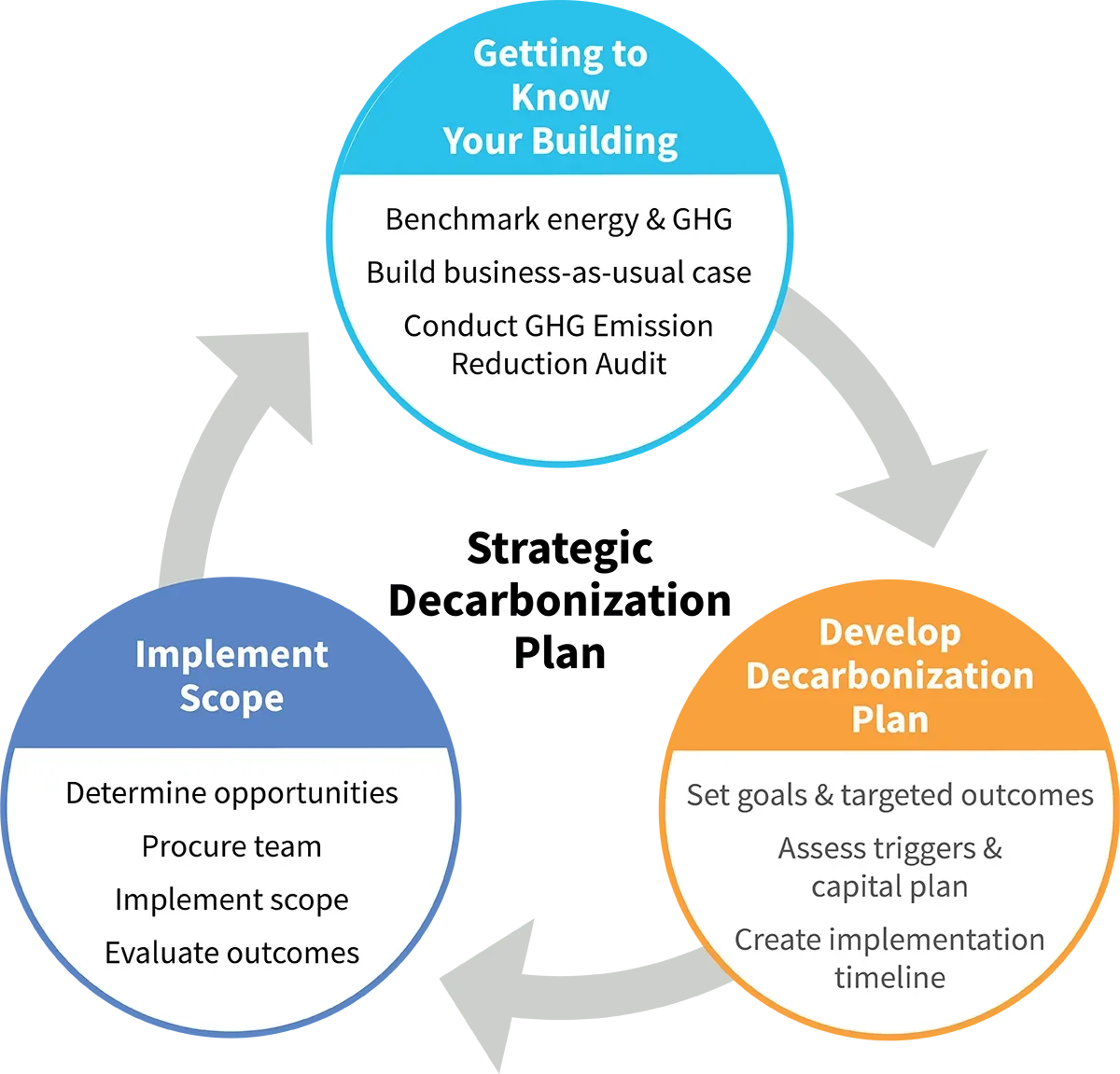 After you finish implementation, document progress and compare the actual outcomes to your measurable goals. Evaluation should start you on the decarbonization plan cycle again, as you continue to get to know your building and update your decarbonization plan.